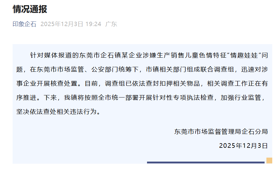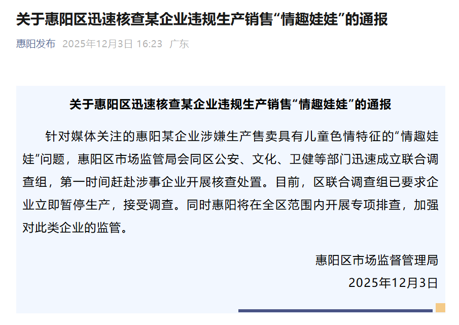 12月3日上午,廣東惠州惠陽區(qū)市場監(jiān)督管理局一名工作人員表示,針對報(bào)道披露的事件,惠陽區(qū)相關(guān)領(lǐng)導(dǎo)高度重視,已召集多部門進(jìn)行聯(lián)合研判。3日下午,惠陽區(qū)市場監(jiān)督管理局發(fā)布情況通報(bào),已會(huì)同區(qū)公安、文化、衛(wèi)健等部門迅速成立聯(lián)合調(diào)查組,要求企業(yè)立即暫停生產(chǎn),接受調(diào)查,同時(shí)將在全區(qū)范圍內(nèi)開展專項(xiàng)排查。3日下午,上海市奉賢區(qū)市場監(jiān)督管理局一名工作人員表示,針對此事,正在調(diào)查中。3日晚間,東莞市市場監(jiān)督管理局企石分局通報(bào)稱,在東莞市市場監(jiān)管、公安部門統(tǒng)籌下,市鎮(zhèn)相關(guān)部門組成聯(lián)合調(diào)查組,目前已依法查封扣押相關(guān)物品,接下來將按照全市統(tǒng)一部署開展針對性專項(xiàng)執(zhí)法檢查。