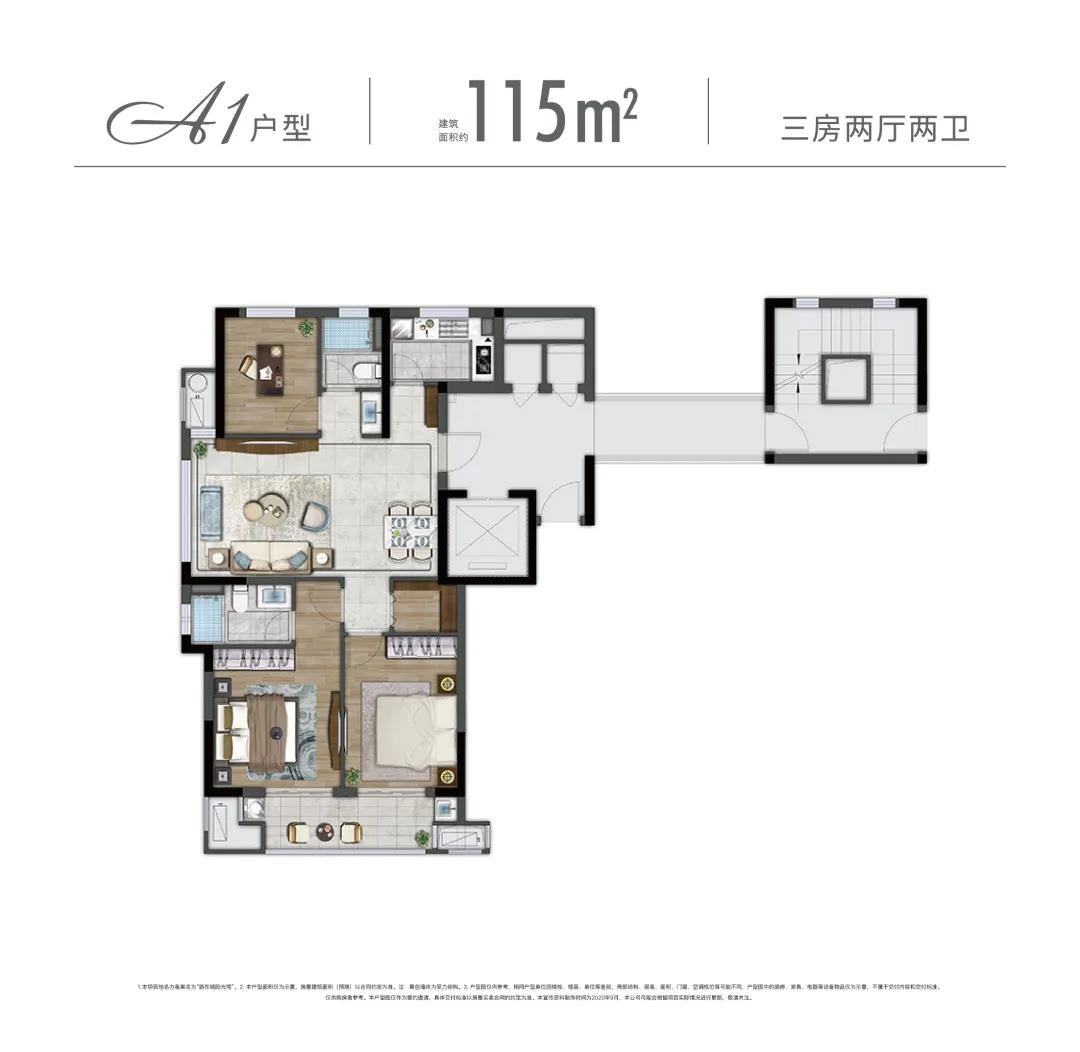 而115㎡同樣作為明星戶型,則更注重陽光、景致與居住私密性。三面采光+餐客廳一體+套房式主臥+雙聯(lián)陽臺,將品質(zhì)與靜謐的生活周到考量,在一方美好空間里,可觀、可賞、可憩。